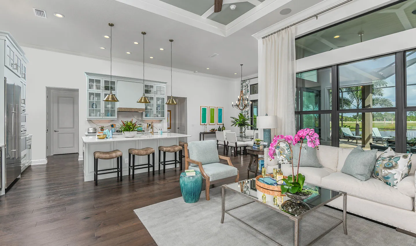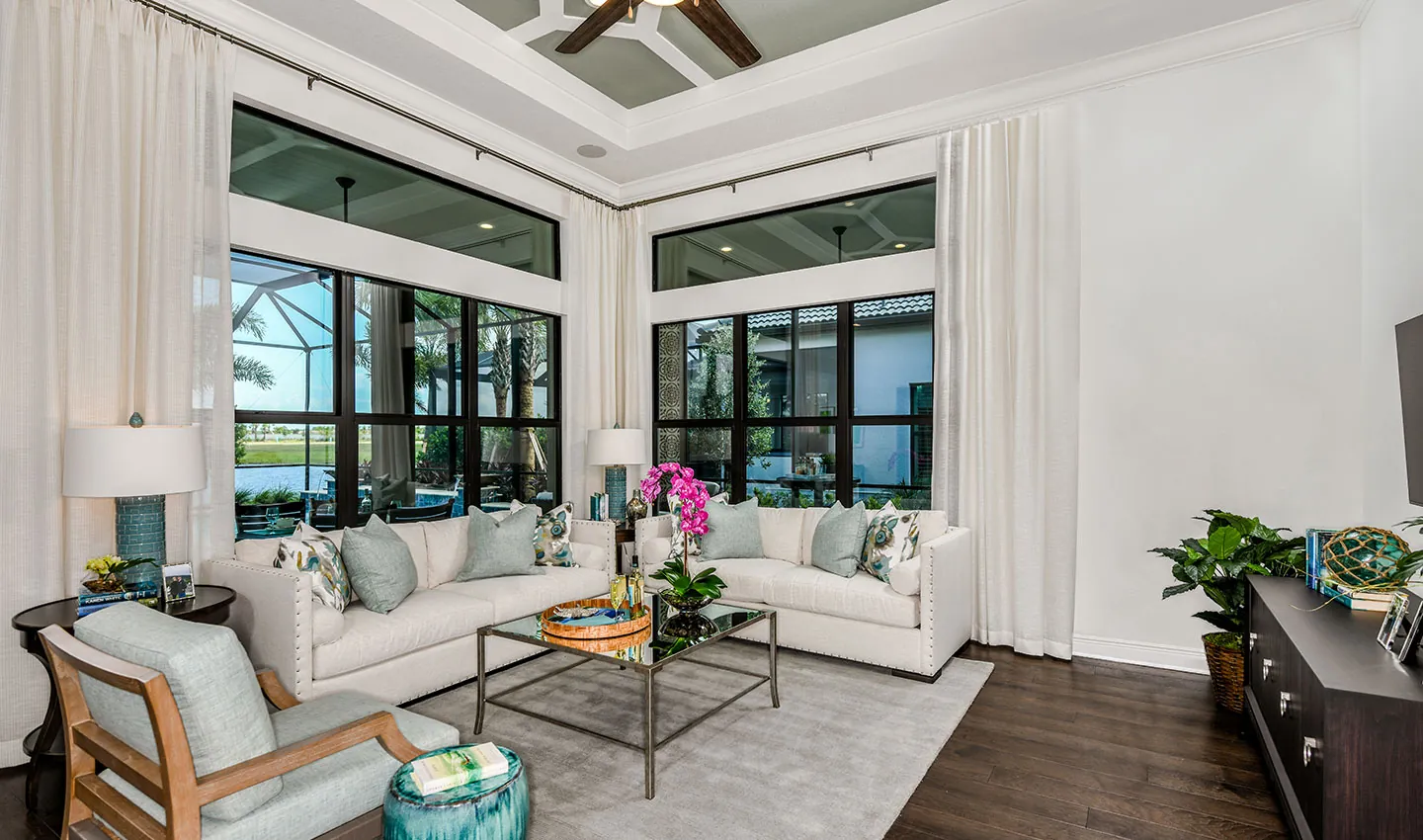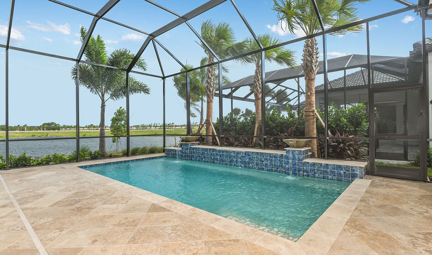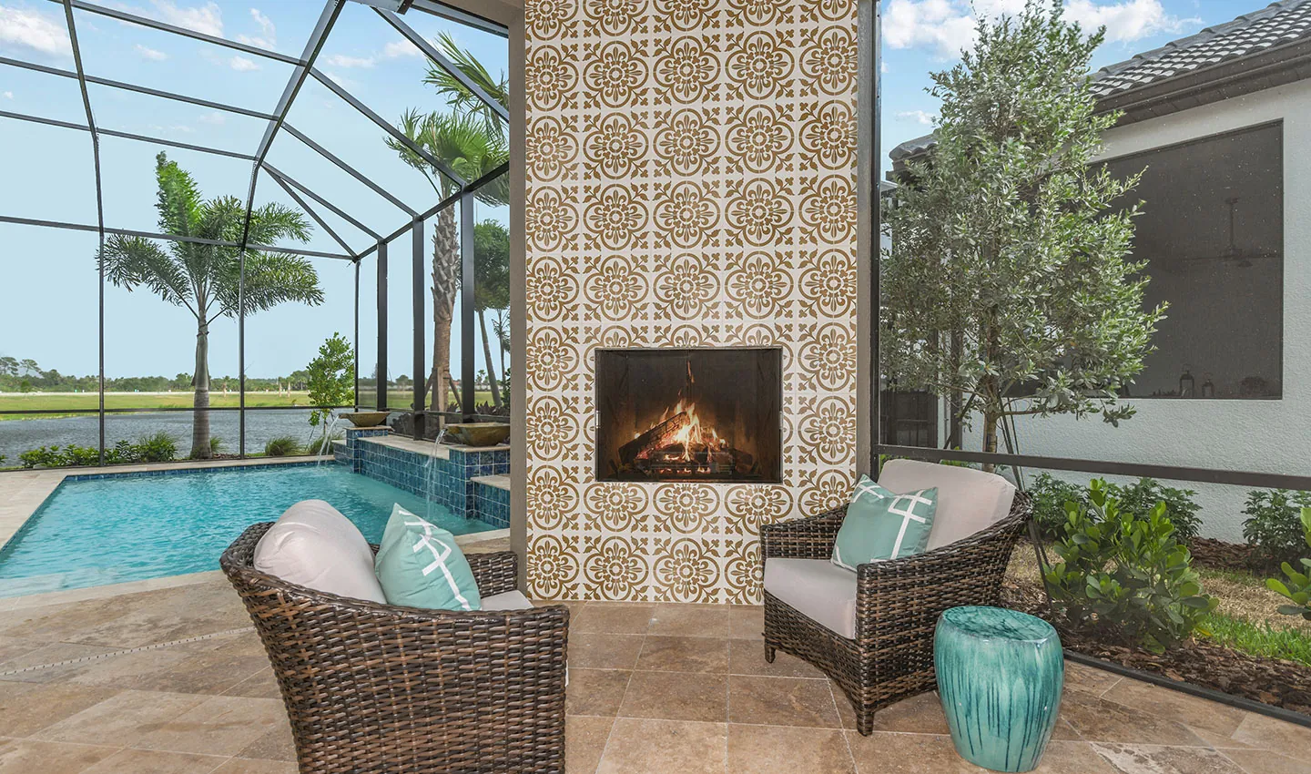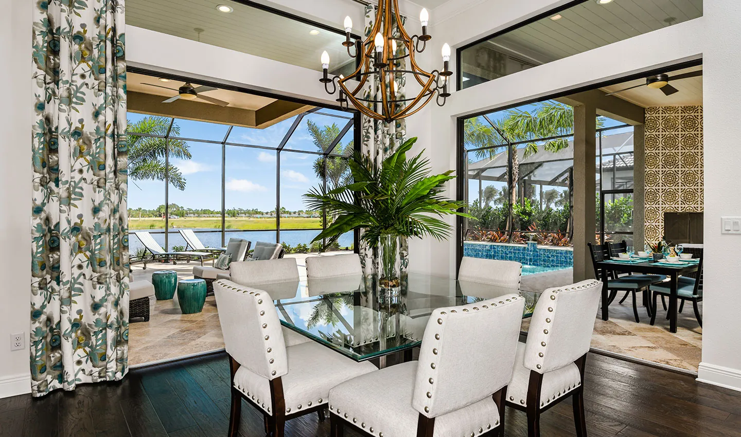 The large outdoor lanai is accessed through sliding glass doors from the Great Room. Many flexible options are available for this home, including options for a fourth bedroom, a wine room, expanded utility room, and private access to the lanai from the master bedroom.